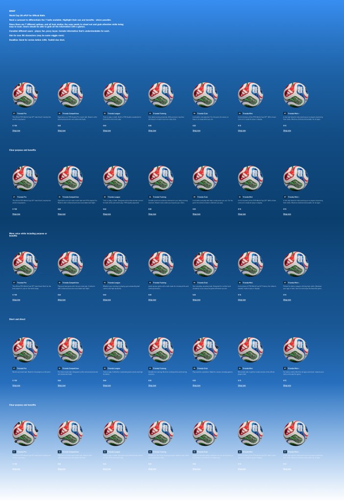 For the World Cup 26 football launch, seven footballs were displayed on a carousel. Overall, the imagery looked extremely similar, despite some subtle differences in the balls. To users who were unsure, they were simply seeing seven of the same balls with very different price points.